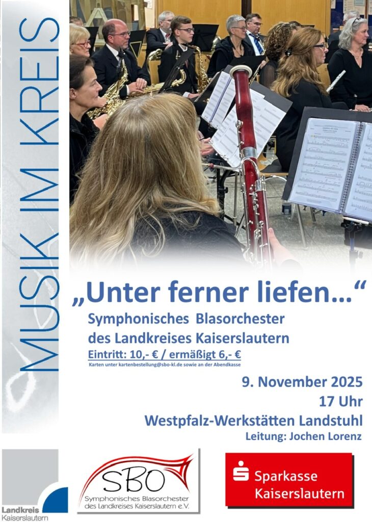 das Symphonisches Blasorchester des Landkreises Kaiserslautern (SBO) konzertiert am Samstag 8.11.2025 um 19:30 Uhr in der Westpfalz Halle in Niederkirchen und am 9.11.2025 um 17:00 Uhr in den Westpfalz-Werkstätten in Landstuhl, Bruchwiesenstraße 31